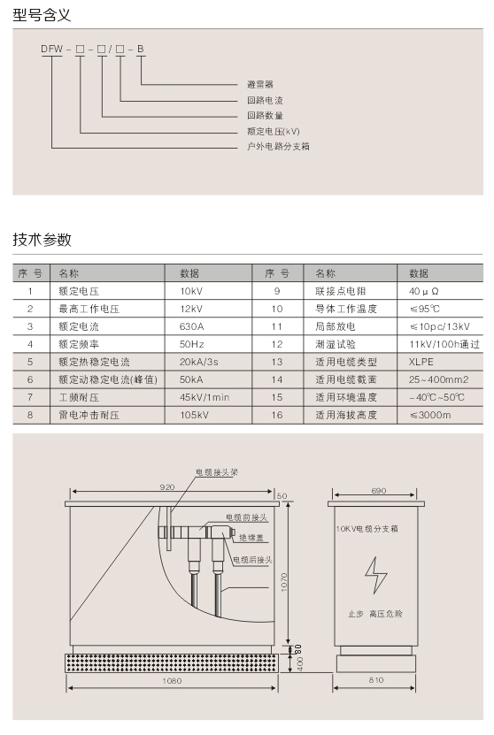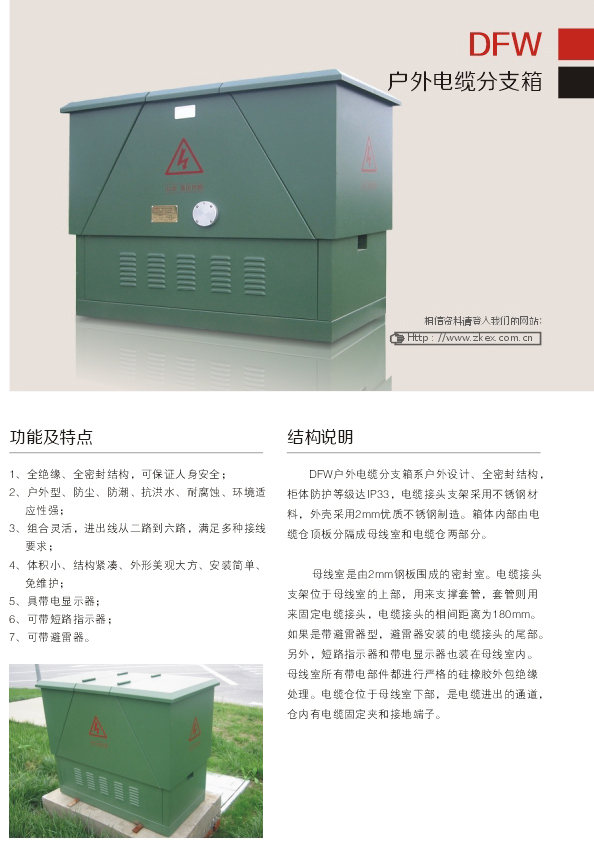 DFW戶外高低壓電纜分授箱系戶外設計、全密封結構,柜體防護等級達IP33,電纜接頭支架采用不銹鋼材料,外殼采用2mm優良不銹鋼制造。箱體內部由電纜倉頂板分隔成母線室和電纜倉兩部分。母線室是由2mm鋼板圍成的密封室。電纜接頭支架位于母線室的上部,用來支撐套管,套管則用來固定電纜接頭,電纜接頭的相間距離為180mm。如果是帶避雷器型,避雷器安裝的電纜接頭的尾…